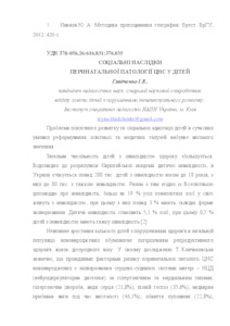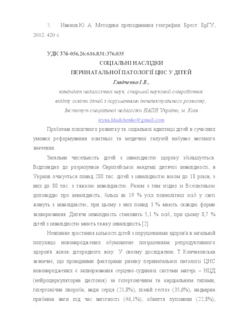 - Гладченко, І. В. (orcid.org/0000-0002-2013-8053) (2018) Social consequences of perinatal pathology of the central nervous system in children «Освіта осіб з особливими потребами: виклики сьогодення» збірник матеріалів Всеукраїнської науково-практичної конференції (21 червня 2018 р.). pp. 37-42.