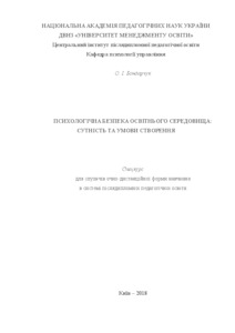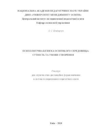 - Бондарчук, О.І. (orcid.org/0000-0003-3920-242X) (2018) Psychological safety of the educational environment: the essence and conditions of creation: a special course for students of distance learning in the system of postgraduate pedagogical education [Teaching Resource]