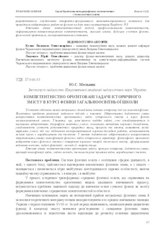 - Мельник, Ю.С. (orcid.org/0000-0002-1268-6199) (2017) Competency-based tasks of historical maintenance in a course physics of general school Наукові записки. – Серія: Проблеми методики фізико-математичної і технологічної освіти, 1 (11). pp. 87-93. ISSN 2521-6791