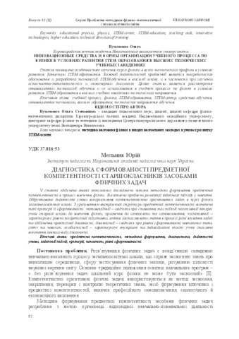 - Мельник, Ю.С. (orcid.org/0000-0002-1268-6199) (2017) Diagnostics of formed of subject competence of senior pupils by facilities of physical tasks Наукові записки. – Серія: Проблеми методики фізико-математичної і технологічної освіти, 1 (12). pp. 92-97. ISSN 2521-6791