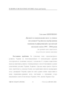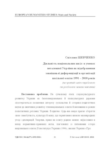- Шевченко, Світлана Миколаївна (2018) The activities of national schools in the conditions of independent Ukraine as a reflection of external differentiation in the organization of school education from 1991 to 2010 (on the example of schools with Jewish and Russian languages of instruction) European humanities studies: State and Society. Europejskie studia humanistyczne: Państwo i Społeczeństwo, 4 (2). pp. 30-41. ISSN 2413-9025