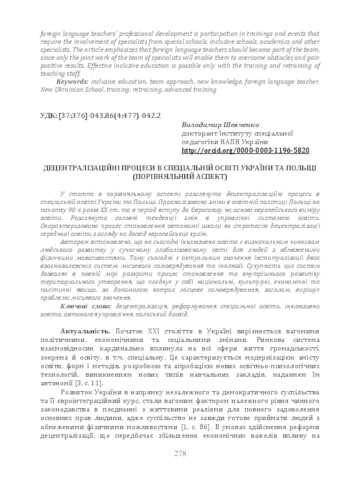 - Шевченко, В.М. (orcid.org/0000-0003-0119-3206) (2017) Decentralization processes in special education of Ukraine and Poland (comparative aspect) Освіта осіб з особливими потребами: шляхи розбудови (13). pp. 278-285. ISSN 2313-4011