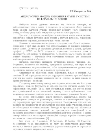 - Котирло, Т.В. (orcid.org/0000-0002-3256-5749) (2018) Andragogic model of teaching parents in the system of non-formal education In: Collection of materials of the XV International Pedagogical-Artistic Readings in the Memory of Professor O.P.Rudnitsky "Continuing Education Education of the 21st Century": Kyiv, December 6-7, 2017. . Інститут педагогічної освіти і освіти дорослих НАПН України, м. Київ, Україна, pp. 89-91.