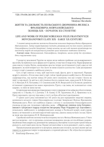 - Шевченко, В.М. (orcid.org/0000-0003-0119-3206) (2017) The life and activities of the Polish nobleman Felix Frantsevich Movchanovsky (late XIX - early XX century) Pedagogical education: theory and practice, 1/1 (22). pp. 247-251. ISSN 2309-9763