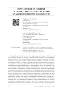 The article deals with the problem of forecasting the development of the content of general secondary education. The definition of “forecasting the development of the content of general secondary education”, which is interpreted by the authors as a process of its quantitative and qualitative changes occurring under the influence of internal and external factors, provides the achievement of a qualitatively new state of its system, its compliance with social needs and personal needs of education applicants on a certain stage of social development. In the context of the study, the significance of educational and pedagogical forecasting as a powerful scientific tool for the development of the content of general secondary education has been substantiated, which makes it possible to determine and assess trends in its development, to develop and justify forecasts, to provide recommendations for the selection and design of the indicated content. The main groups of factors of the forecast background of development of general secondary education external to this object are forecasted and briefly analysed, and prediction of the conditions and factors influencing it). It is substantiated that in the conditions of reforming general secondary education the weight of organizational-political (state educational policy), economic (labour market, information sphere development, labour migration, etc.), international factors (international educational cooperation, entering into the world and European educational space, etc.). Traditionally, the influence of scientific and technological factors, caused by scientific and technological progress (at the present stage, is the development of computer technology and information and com of further researches with refinement of the terminology system and the substantiation of the conceptual foundations for forecasting the development of the content of general secondary education, the development of a theoretical model and technology that will ensure the implementation of this process. munication technologies, etc.) remains. The authors attribute perspectives of further researches with refinement of the terminology system and the substantiation of the conceptual foundations for forecasting the development of the content of general secondary education, the development of a theoretical model and technology that will ensure the implementation of this process.
