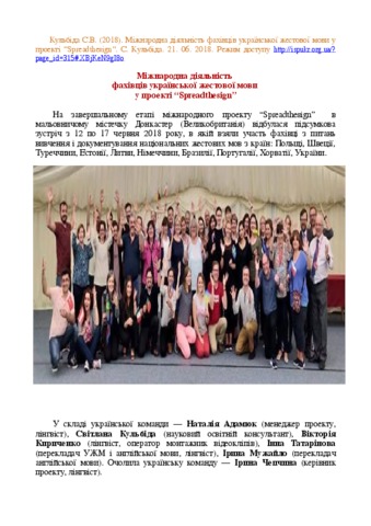 - Кульбіда, С.В. (orcid.org/0000-0002-0194-3495) (2018) International activity of experts of the Ukrainian sign language in the project "Spreadthesign" In: Інститут спеціальної педагогіки і психології імені Миколи Ярмаченка НАПН України . Інститут спеціальної педагогіки НАПН України, м. Київ, Україна.
