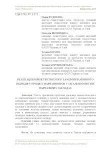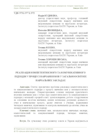 - Кудикіна, Надія Василівна, Яновицька, Наталія Іванівна, Кохно, Тетяна Назіфівна and Хорошковська, Тетяна Петрівна (2017) Implementation of competence-based and communicative approach in teaching languages at secondary schools. Адаптивне управління: теорія і практика. Серія «Педагогіка», 3 (5).