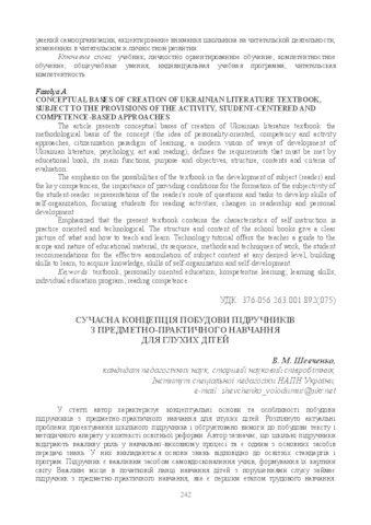 - Шевченко, В.М. (orcid.org/0000-0003-0119-3206) (2017) Contemporary concept of constructing textbooks on subject-practical training for deaf children Problems of the modern textbook (18). pp. 242-249. ISSN 2411-1309