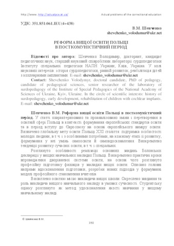 - Шевченко, В.М. (2017) Reform of Polish higher education in the post-communist period Actual questions of correctional education (pedagogical sciences) (10). pp. 390-400. ISSN 2413-2578