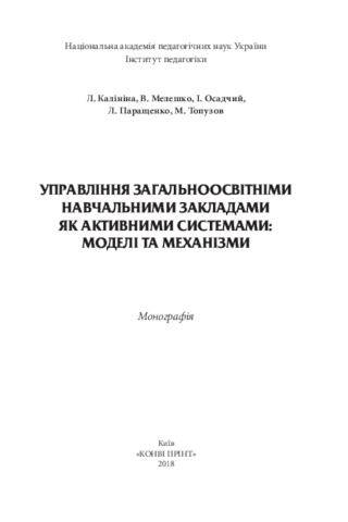 The monograph presents the solution of the scientific problem of substantiation of theoretical and conceptual foundations of state and public management of educational institutions as active social-pedagogical systems in the information society; the methodology of construction, modernization and implementation of the system of state and public administration of educational institutions and its active component of an integrated management mechanism is given; the specifics of management activity are determined. In the monograph the methodological and theoretical foundations of state and public administration as a scientific phenomenon and object of research in the theory and methodology of educational management, the conceptual foundations of active systems in the three-component system "active system – state and public administration – management mechanism" are disclosed for the first time; the conceptual model of the management of educational institutions and its submodel, the social context of the management mechanism are theoretically substantiated and the principles of the mechanisms in the coordinates "activity – launch of mechanisms – efficiency of management" are grounded; the interconnection of the binary system "management – management mechanism" was analyzed and its influence on the efficiency of the management process and management activity of the head of the educational institution in the modern conditions of multi-vector development of the information society was revealed. The monograph is intended for scientists, pedagogical workers, managers of various hierarchical levels of government, government employees and representatives of united territorial communities, teachers of the institutions of postgraduate education and public institutions which direct their activities to the management of general secondary education; students, doctoral students and postgraduate students who study the problems of educational management and its reform on an innovative basis.