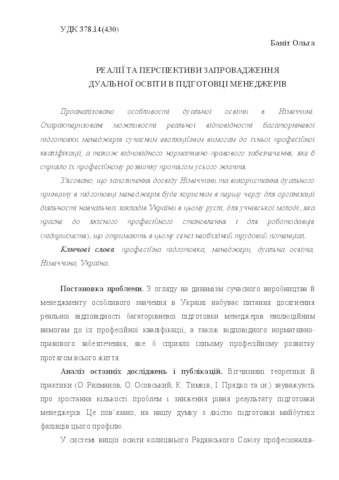 - Баніт, Ольга Василівна (2018) Реалии и перспективы внедрения дуальной образования в подготовке менеджеров Наукові записки Малої академії наук України (11). pp. 8-17. ISSN 2618-0529