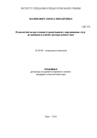 - Малинович, Л.М. (2015) Psychological principles of readiness of preschool children with hearing impairments to study in educational institutions of various types with hearing impairments Dissertation candidate2 thesis, Інститут спеціальної педагогіки.