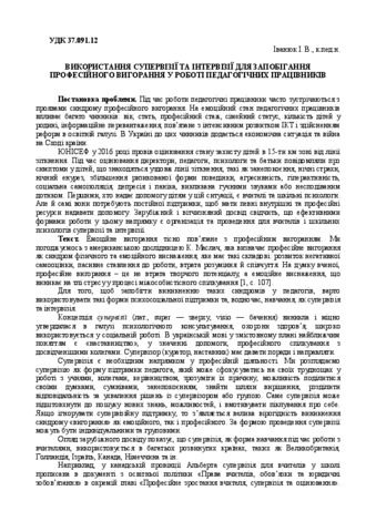 The use of supervision and intervision in the professional activity of teachers makes it possible to effectively prevent their emotional and professional burnout.In Ukraine, for the first time, a program of psychosocial support, which includes regular supervision, for teachers and school psychologists has been developed and implemented by specialists of the National University of Kyiv-Mohyla Academy in the eastern regions of the country. But among the teachers around the country, this practice is not used, because there is no system for the preparation of supervisors, most teachers are not familiar with this concept at all. Intervision practice at the foreign school of schools is quite developed, carried out systematically, aimed at creating a special and safe space for professional support, the exchange of experience and information, and prevents emotional and professional degradation. In Ukrainian schools, the inter-colleagues are partially part-time. Therefore, this form of work requires support and development by the leadership of general education institutions and specialists in the system of institutes of postgraduate pedagogical education.