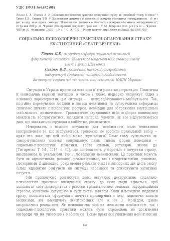 - Тітова, Катерина Валеріївна and Савінов, Володимир Вікторович (orcid.org/0000-0001-5830-2333) (2018) Socio-psychological practices of coping with fear as a spontaneous "Security Theater" Психологічна допомога особистості в складних обставинах життєдіяльності : зб. тез доп. всеукр. наук.-практ. семінару “Психологічна допомога особистості в складних обставинах життєдіяльності”, 18 травня 2018 р., м. Чернівці. pp. 147-150.