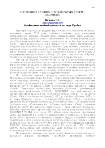 - Ничкало, Нелля Григорівна (orcid.org/0000-0002-5989-5684) (2018) Prospects for the adult education development in Ukraine (afterword) Conceptual foundations of adult education development: world experience, Ukrainian realities and perspectives. pp. 602-606.