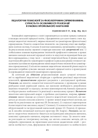 - Барановська, Олена Володимирівна (orcid.org/0000-0002-0788-8511) (2018) Pedagogical technologies of the philological direction: the essence and peculiarities of realization in the conditions of profile education In: Анотовані результати науково-дослідної роботи Інституту педагогіки НАПН України за 2018 рік . Педагогічна думка, м. Київ, Україна, pp. 85-86. ISBN 978-966-644-464-9