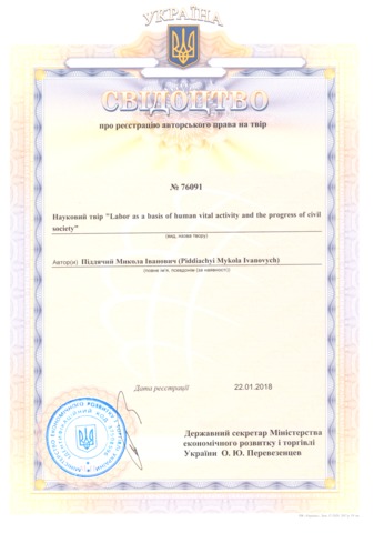 Piddiachyi Mykola Ivanovych (2018) Certificate for scientific work "Labor as a basis of human vital activity and the progress of civil society" 76091.