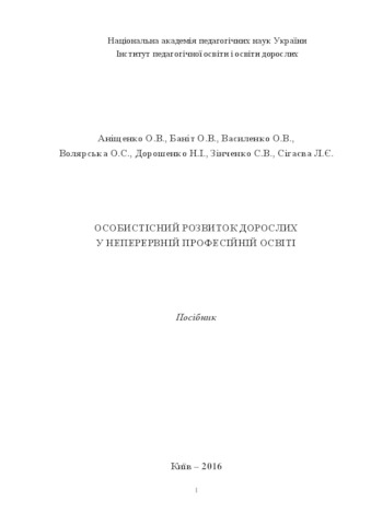 Аніщенко, Олена Валеріївна (orcid.org/0000-0002-6145-2321), Баніт, Ольга Василівна, Василенко, Олена Вікторівна, Волярська, Олена Станіславівна (orcid.org/0000-0002-6812-1154), Дорошенко, Надія Іванівна (orcid.org/0000-0001-9002-6439), Зінченко, Світлана Володимирівна (orcid.org/0000-0002-9829-6449) and Сігаєва, Лариса Євгеніївна (2016) Personal development of adults in continuing vocational education . Інститут педагогічної освіти і освіти дорослих НАПН України, м. Київ, Україна. (Unpublished)