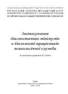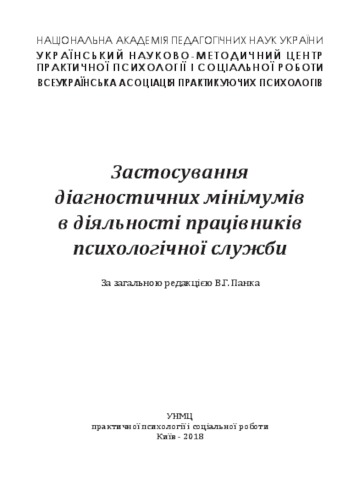 Methodical recommendations "Application of diagnostic minima in the work of psychological service workers" was developed within the framework of the scientific research "Scientific and methodological principles of the development and implementation of algorithms, cyclograms, diagnostic minima of the staff of the psychological service of the education system" (state registration number 0117U000162). The publication outlines the methodical principles of psychodiagnostic work of psychological service employees; features of diagnostic activity of specialists in pre-school establishments, institutions of general secondary education and pedagogical workers are considered; a list of diagnostic techniques for use with different target audiences is presented. In the development of methodological recommendations materials of psychological services of Vinnytsia, Zaporizhzhya, Dnipropetrovsk, Ivano-Frankivsk, Lviv, Sumy, and Chernivtsi regions were applied. For practical psychologists, social educators, methodologists from the psychological service, students of the corresponding specialties, university teachers.