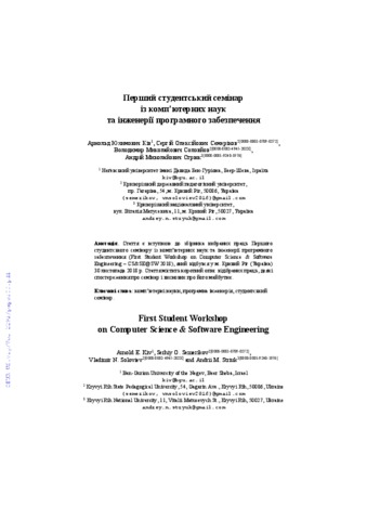 - Ків, А. Ю., Семеріков, С.О. (orcid.org/0000-0003-0789-0272), Соловйов, В.М. (orcid.org/0000-0002-4945-202X) and Стрюк, А.М. (orcid.org/0000-0001-9240-1976) (2018) First student workshop on computer science & software engineering Computer Science & Software Engineering : Proceedings of the 1st Student Workshop (CS&SE@SW 2018), Kryvyi Rih, Ukraine, November 30, 2018 (2292). pp. 1-10. ISSN 1613-0073