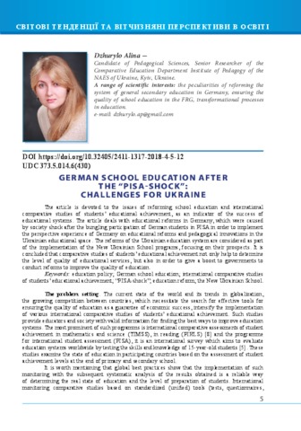 - Dzhurylo, A.P. (orcid.org/0000-0002-5129-6724) (2018) German school education after the “PISA-shock”: challenges for Ukraine Ukrainian Educational Journal (4). pp. 5-12. ISSN 2411-1317