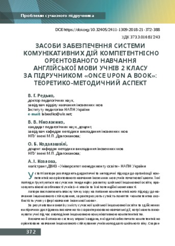 - Редько, Валерій Григорович, Ніколаєнко, В. В., Кодалашвілі, О. Б. and Козлова, Альона Ігорівна (2018) Means of ensuring the system of communicative actions of competent English language learning of 2-nd grade pupils by textbook «Once upon a book»: theoretical – methodological aspect Проблеми сучасного підручника (21). pp. 372-388. ISSN 2411-7447