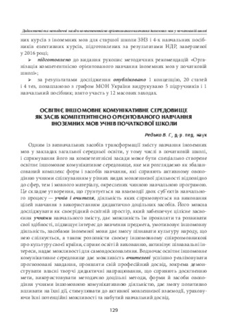 - Редько, Валерій Григорович (2018) Educational foreign communication environment as a means of competence-oriented teaching of foreign languages for elementary school students In: Анотовані результати науково-дослідної роботи Інституту педагогіки НАПН України за 2018 рік . Педагогічна думка, м. Київ, Україна, pp. 129-131. ISBN 978-966-644-464-9
