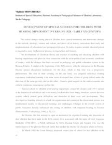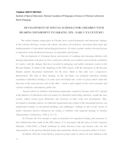 - Shevchenko, Vladimir (orcid.org/0000-0003-0119-3206) (2015) Development of special schools for children with hearing mpairment in ukraine (XIX - early XX century) Education yesterday - today - tomorrow. pp. 43-49. ISSN ISBN 978-83-88100-38-3