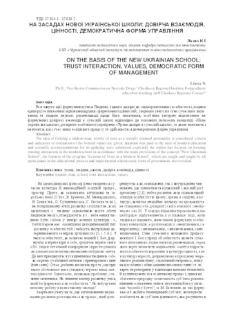 - Лісова, Н.І. (2018) On the basis of the new ukrainian school: trust interaction, values, democratic form of management Slovak international scientific journal, 2 (15). pp. 13-16. ISSN 5782-5319
