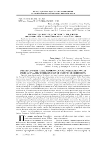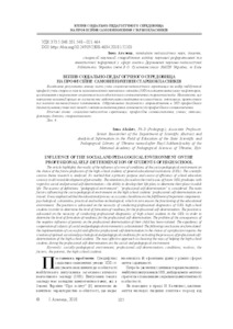 The article highlights the results of the influence of a row of conditions of the socio-pedagogical environment on the choice of the future profession of the high school students of general educational institutions (GEIs). The scientific sources theme research is analyzed. It’s marked that a primary purpose and source of efficiency of school education consists in all-round development of personality. The attention is focused on the vital issues of future GEIs graduates with regard to social and personal self-determination – the ability to develop their life plan, to determine their place in adult life. The essence of definitions “pedagogical environment”, “professional self-determination” is considered. The main factors influencing the socio-pedagogical environment on the high school students’ professional self-determination are traced. It was emphasized that the educational process as a system should ensure the fulfillment of important components: psychological, substantive, practical and techno-technological, which in turn ensure the functioning of the educational environment. The position is advocated on the necessity of conducting professional diagnostics of GEIs high school students in order to determine the level of formation of readiness for the professional self-determination. The position is advocated on the necessity of conducting professional diagnostics of high school students in the GEIs in order to determine the level of formation of readiness for the professional self-determination. The problem of the consequences of the negative influence of parents on the professional determination of their child has been violated. The expediency of cooperation of subjects of social and pedagogical environment is substantiated. The following conclusions are formulated: the implementation of successful and effective professional self-determination in the choice of a profession requires the creation of optimal social and psychological and pedagogical conditions for activating the processes of professional selfdetermination of the high school students. The most effective approach to choosing the ways of helping the high school students during the professional self-determination are the social and pedagogical environment.