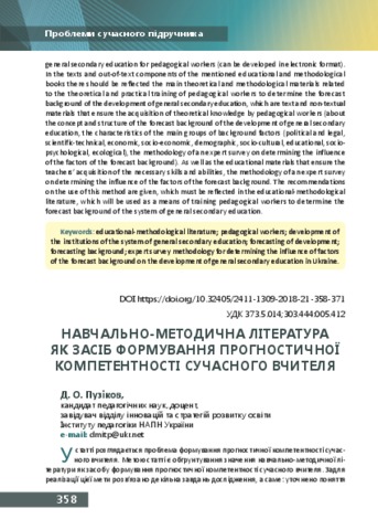 The article deals with the problem of formation of the forecasting competence of a modern teacher. The purpose of the article is to justify the value of educational and methodological literature as a means of forming the forecasting competence of a modern teacher. The results of the analysis of scientific literature on the research problem have made it possible to clarify the definition of the concept and to disclose the structure of the teacher`s forecasting competence, namely: value-motivational (values, motives, goals that prompt for forecasting activity, is its value-motivational core), cognitive (knowledge about theory and practice of prognostic activity in the system of general secondary education), operational-activity component (skills and abilities, practical experience of forecasting activity in the system of general secondary education). The elements of these components should be reflected in the structure of educational and methodical publications, which will become the means of forming the forecasting competence of a modern teacher. The study made it possible to determine the peculiarities of the use of educational and methodical literature in the process of formation of the teacher's forecasting competence in the conditions of obtaining a formal (rational distribution of educational materials, through which this competence will be formed, according to different academic disciplines, years of study, that is, different textbooks and manuals, the possibility of development a special course on educational-pedagogical forecasting (hence the corresponding textbook or manual): the leading role of educational literature; the need to create an appropriate literature for teachers), non-formal (appropriate combination of a textbook on the theory and practice of forecasting activity in the system of general secondary education with educational materials on educational- pedagogical forecasting in textbooks and manuals) or informal education (the need to develop a self-learning manual on the theory and practice of forecasting activity) Prospects for further research on this problem are related to the development of educational technology of formation of the forecasting competence of teachers; designing, publishing and distributing textbooks and manuals necessary for its realization.