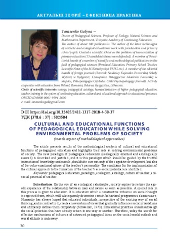 - Tarasenko, Galyna (orcid.org/0000-0001-9394-2600) (2018) Cultural and educational functions of pedagogical education while solving environmental problems of society (search aspect of methodological approaches) Український педагогічний журнал, 4. pp. 30-37. ISSN 2411-1317