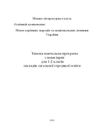 A typical Hebrew educational program for institutions of general secondary education is developed in accordance with the Law of Ukraine "On Education" (2017), the State Standard of Elementary Education, approved by the Resolution of the Cabinet of Ministers of Ukraine of February 21, 2018, No. 87 and approved by the Order of the Ministry of Education and Science of Ukraine March 21, 2018, No. 268. It is part of a typical educational program and is based on relevant key European competencies. The program defines the goal of setting up the initial course of studying the Hebrew language in institutions of general secondary education, the principles and methodological principles for selecting the content of the educational material, the following content lines of the curriculum as "Interact Oral", "Read", "Interact In Writing", "Explore the Media" "," Explore the language phenomena ". Content lines are implemented through the following integrated courses: in class 1 - "Practical oral course" (1st semester); "Diploma training" (II semester); in the 2nd form - the integrated course "Study of the Letters". Also, the program defines the general expected results of the I cycle of education, the indicative parameters of the students' learning and cognitive achievements, and the concrete expected results and content of the I cycle of education in accordance with the class, content lines and types of speech activity.