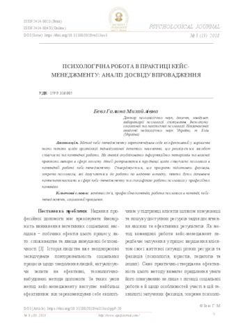 - Бевз, Г. М. (orcid.org/0000-0003-2487-5429) (2018) Psychological work in case management practice: analysis of implementation experience Психологічний часопис, 3 (13). pp. 9-20. ISSN 2414-0023