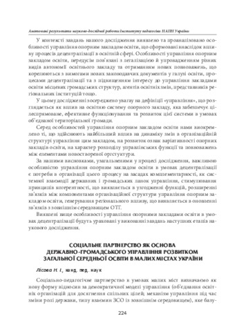 - Лісова, Н.І. (2018) Social partnership as the basis of state and public administration for the development of general secondary education in small cities of Ukraine In: Анотовані результати науково-дослідної роботи Інституту педагогіки НАПН України за 2018 рік . Педагогічна думка, м. Київ, Україна, pp. 224-225. ISBN 978-966-644-464-9