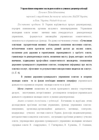 - Попович, Л.М. (orcid.org/0000-0001-8231-8124) (2018) Management of the basic educational institution under the conditions of decentralization Освітні інновації: філософія психологія, педагогіка, 2. pp. 269-272. ISSN 978-617-7487-41-7