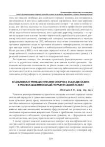 The development of decentralized management of the institution of general secondary education is primarily connected with the modern requirements of society to the quality of education, the challenges of the modern labor market, the strengthening of the connection with the ever changing and developing environment. An indicator of the decentralization of the education management system is the active cooperation and coordination of the activities of various institutions, each of which has a legally defined scope of autonomy, which is consistent with the relevant normative documents. One of the most difficult issues solved in the united territorial communities is the formation of a new educational system, the center of which is the reference educational institution.