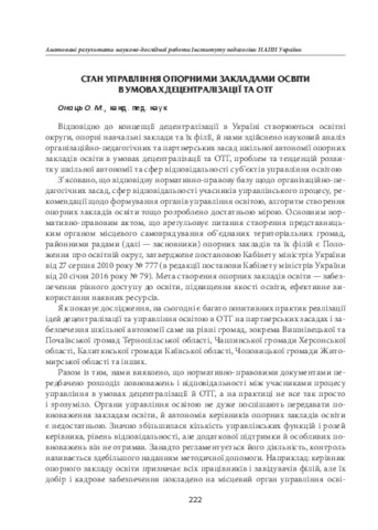 In accordance with the concept of decentralization, educational districts, basic educational institutions and their branches are being created in Ukraine, and we have carried out a scientific analysis of organizational and pedagogical and partnership principles of school autonomy of basic educational institutions in the conditions of decentralization and OTG, problems and trends of the development of school autonomy and areas of responsibility of subjects education management.