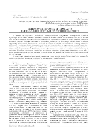 - Сухенко, Яна Валеріївна (orcid.org/0000-0001-7440-2537) (2018) Psychological time as a determinant of individual educational path Наука і освіта, 5-6. pp. 110-116. ISSN 2311-8466