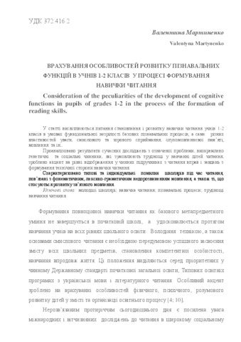 - Мартиненко, Валентина Олександрівна (2018) Consideration of the peculiarities of the development of cognitive functions in pupils of grades 1-2 in the process of the formation of reading skills Педагогічна освіта: теорія і практика, 2 (25). pp. 215-222. ISSN 2309-9763