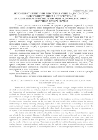 - Пометун, Олена Іванівна and Гупан, Нестор Миколайович (2018) How to develop critical influence of staff with a new researcher from the history of Ukraine Історія і суспільствознавство в школах України: теорія та методика навчання, 2. pp. 69-76.
