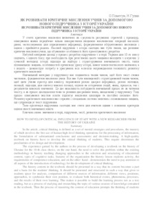In the article, critical thinking is defined as a set of mental strategies and procedures, the mastery of which involves the free use of human high-level thinking operations for the processing of information, the formulation of substantiated conclusions and assessments and decision-making. A high-quality textbook on history have to develop the critical thinking of students. This require determines the peculiarities of its design and development. The experience gained by the authors in the process of developing a textbook on the history of Ukraine for the 10-th class shows, on the one hand, the need to solve this problem within the existing methodology in history teaching changing approaches to the selection and structuring of educational content, types of cognitive tasks, features of the organization the history lesson students activity, the requirements of competence education, and on the other hand - demonstrates the need to pay attention to all aspects of the introduction of technology for the development of critical thinking. The history content in the textbook should be presented in a way that its content becomes a part and a basis for the students' thinking. It should be presented and structured in such a way that gives to students space for analysis, comparison of different sources of information, different views, positions, approaches, to synthesize their own position, to evaluate both historical events, phenomena, processes, and the results of their own learning. This makes it possible to build the learning process not as a text reading, but as a process of studying and researching the topic of various sources of knowledge contained in the textbook. Then the process of mastering the content of education prompts the thinking of students and constantly updates it. The development of critical thinking should also contribute to a special system of questions and cognitive tasks that accompanies the text of the textbook. This textbook orientation today should oriented teachers for one of the main criteria for assessment of the textbook quality.