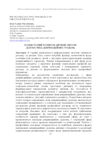 - Бевз, Г. М. (orcid.org/0000-0003-2487-5429) (2018) personal growth of orphan child: deprivation affect diagnostics Вiсник пiслядипломноi освiти: збірник наукових праць. Серiя «Соцiальнi та поведiнковi науки», 6 (35). pp. 22-34. ISSN 2522-9931