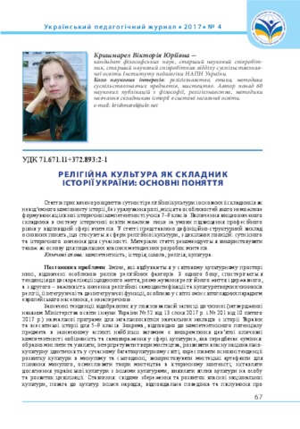 - Кришмарел, В. Ю. (2017) Religious culture as a component of the history of Ukraine: basic concepts Український педагогічний журнал, 4. pp. 67-75. ISSN 2411-1317