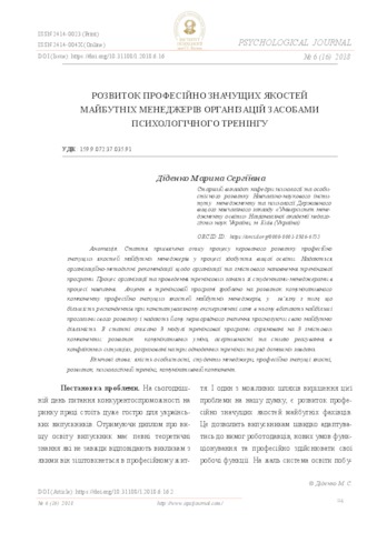 - Діденко, М.С. (2018) Development of professionally significant qualities of future managers of organizations through psychological training Психологічний часопис, 6 (16). pp. 24-37. ISSN 2414-0023