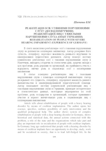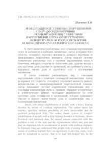 - Шевченко, В.М. (orcid.org/0000-0003-0119-3206) (2014) Rehabilitation of people with severe hearing impairment (experience of Germany) A child with sensory impairments: development, training, education (5). pp. 144-154. ISSN 2313-4542