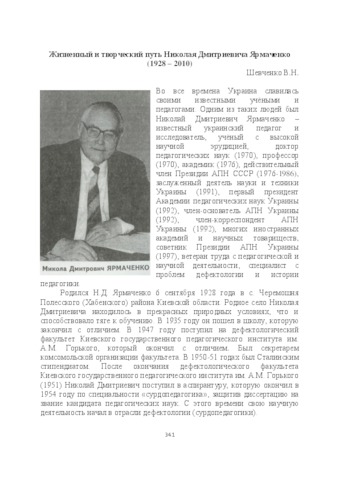 | Keywords: | Nikolay Dmitriyevich Yarmachenko, biography, deaf-and-dumb pedagogy, methodology and history of pedagogy, works of the scientist, Institute of Pedagogy, director |