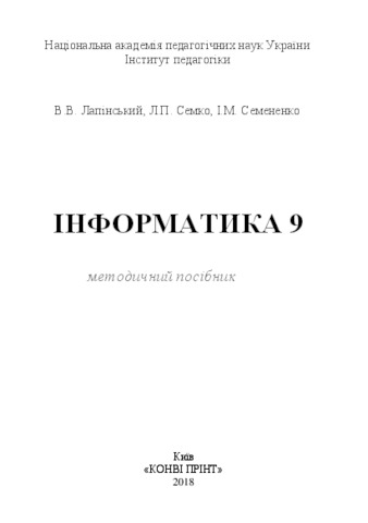 Семко, Лариса Петрівна, Лапінський, В.В. (orcid.org/0000-0002-2832-4774) and Семененко, Ірина Миколаївна (2018) "Informatics 9": methodical manual . ТОВ «КОНВІ ПРІНТ», м. Київ, Україна. ISBN 978-617-7724-20-8