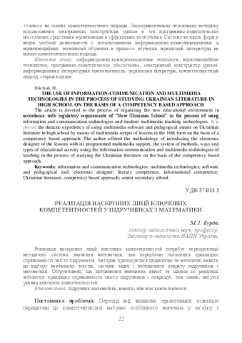 - Бурда, Михайло Іванович (2017) Realization of crosscutting lines of key competencies in mathematics textbooks Проблеми сучасного підручника (19). pp. 22-28. ISSN 2411-1309