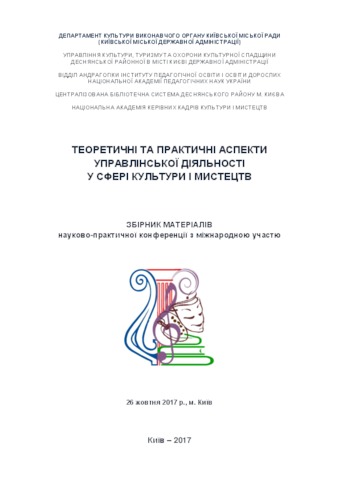 The collection contains articles on topical issues of management activity in the field of culture and arts, describes pedagogical traditions and innovations in extracurricular educational institutions, features of Ukrainian art and education in the context of the dialogue of cultures are highlighted, peculiarities of the activity of the modern library as an open space of socio-cultural communication are outlined.